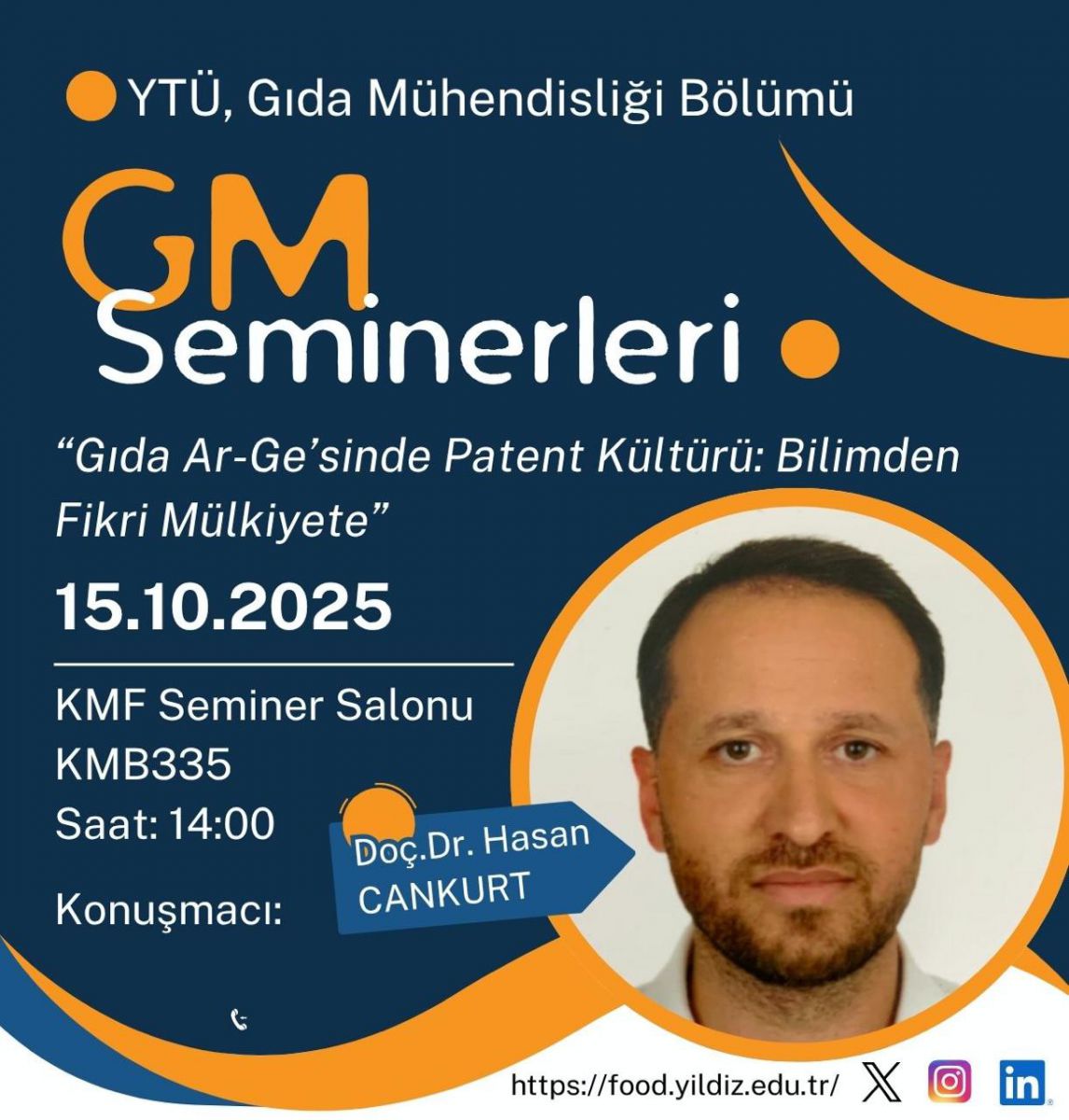 YTÜ Gıda Mühendisliği Bölümü olarak düzenlediğimiz GM Seminerleri kapsamında, bölümümüz öğretim üyesi Doç. Dr. Hasan CANKURT'u ağırlıyoruz!